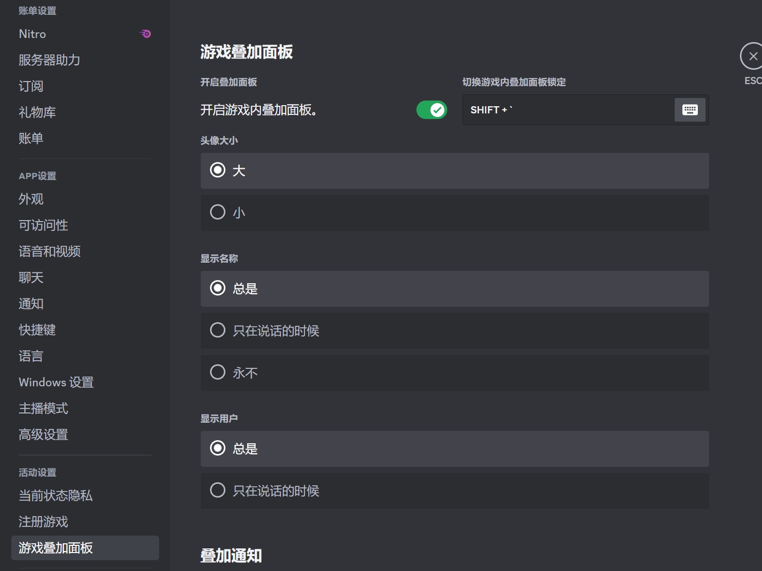 用户设置-游戏叠加面板
