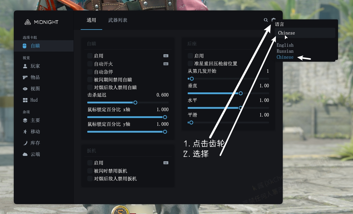 在说明前请查看午夜CS2功能展示,里面有关于午夜自瞄页面的功能说明,以便于你理解!