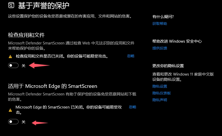 1.病毒防护设置→应用和浏览器控制→关闭所有设置