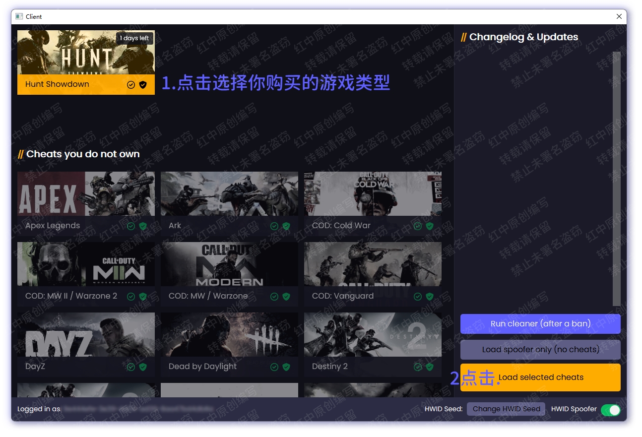 登录后,选择你买的游戏类型,然后点击Load selected cheats注入,等待提示你重启电脑