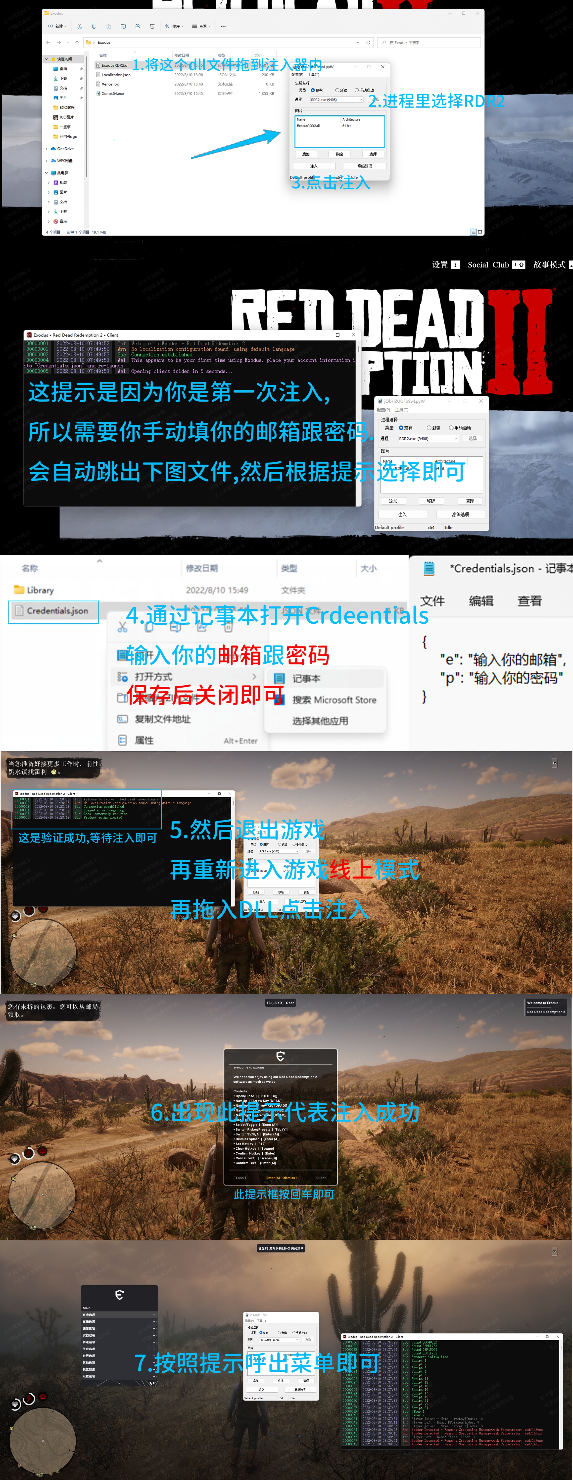 RDR2.exe作为 Xenos 注入器中的进程,然后点击注入等待控制台窗口打开,要求你在“Credentials.json”中输入你的邮箱密码