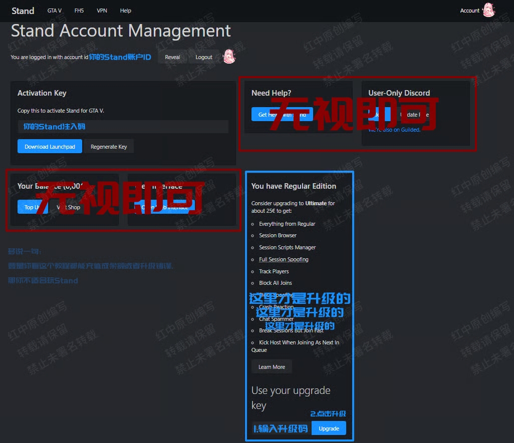 格式是Stand-Upgrade后面的一大堆英文这种激活码,你按照下方升级教程,在Stand官网登录你的账户ID后升级,然后复制注入码正常注入就行