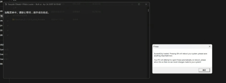 出现Frieza白色弹窗后即代表注入初步完成,点击确定会自动重启电脑(重启是正常的)